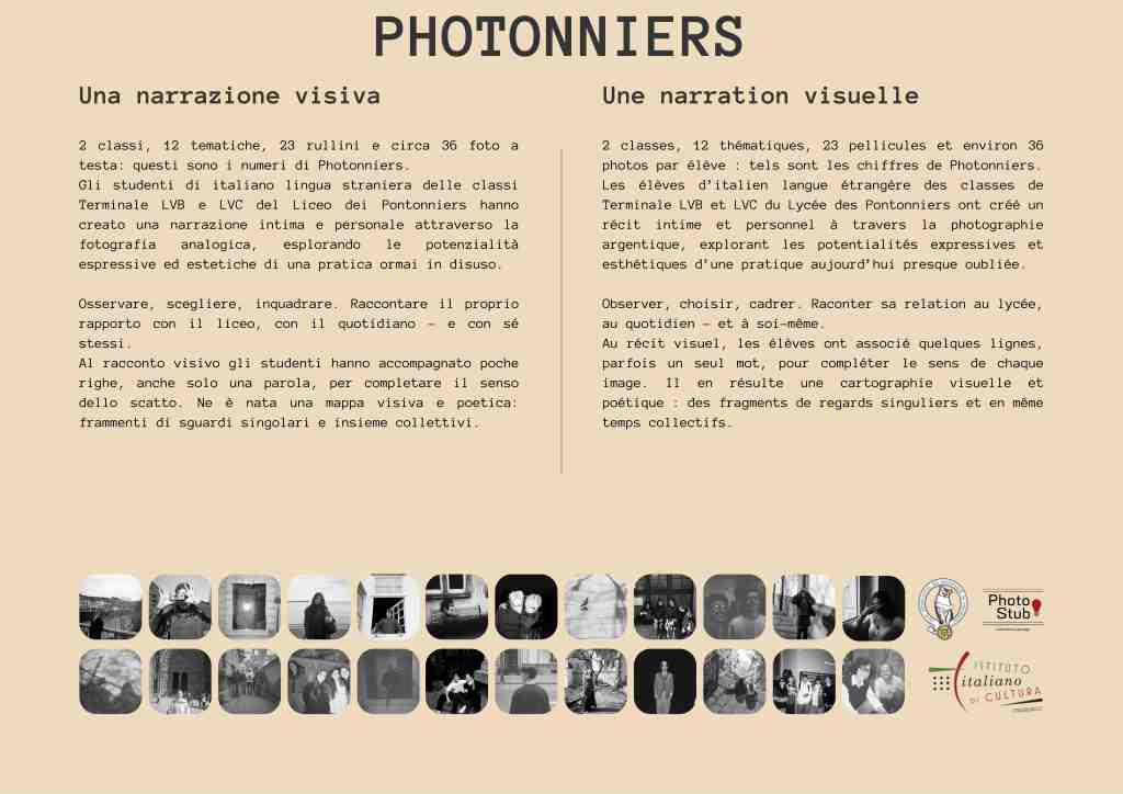 Vous avez jusqu’au 13 juin pour visiter l’exposition Photonniers. Une narration visuelle, qui présente le travail photographique des étudiants d’italien langue étrangère du Lycée International des Pontonniers.